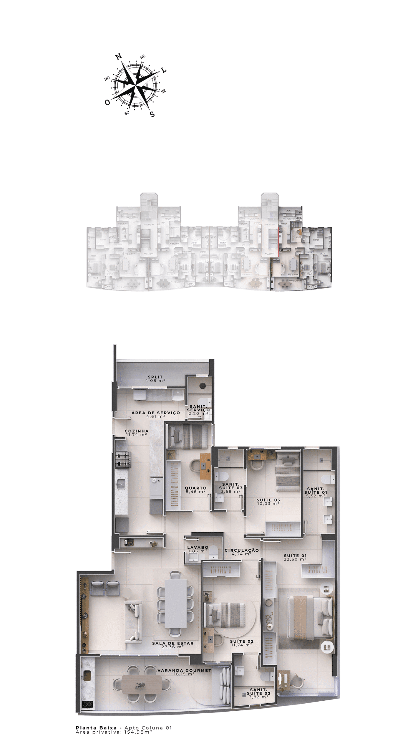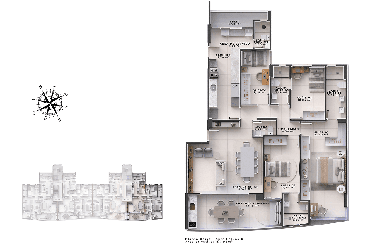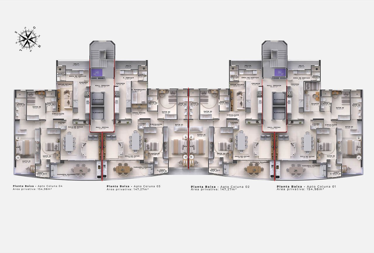 - 154,98 m²: 3 suítes + lavabo + multiuso.