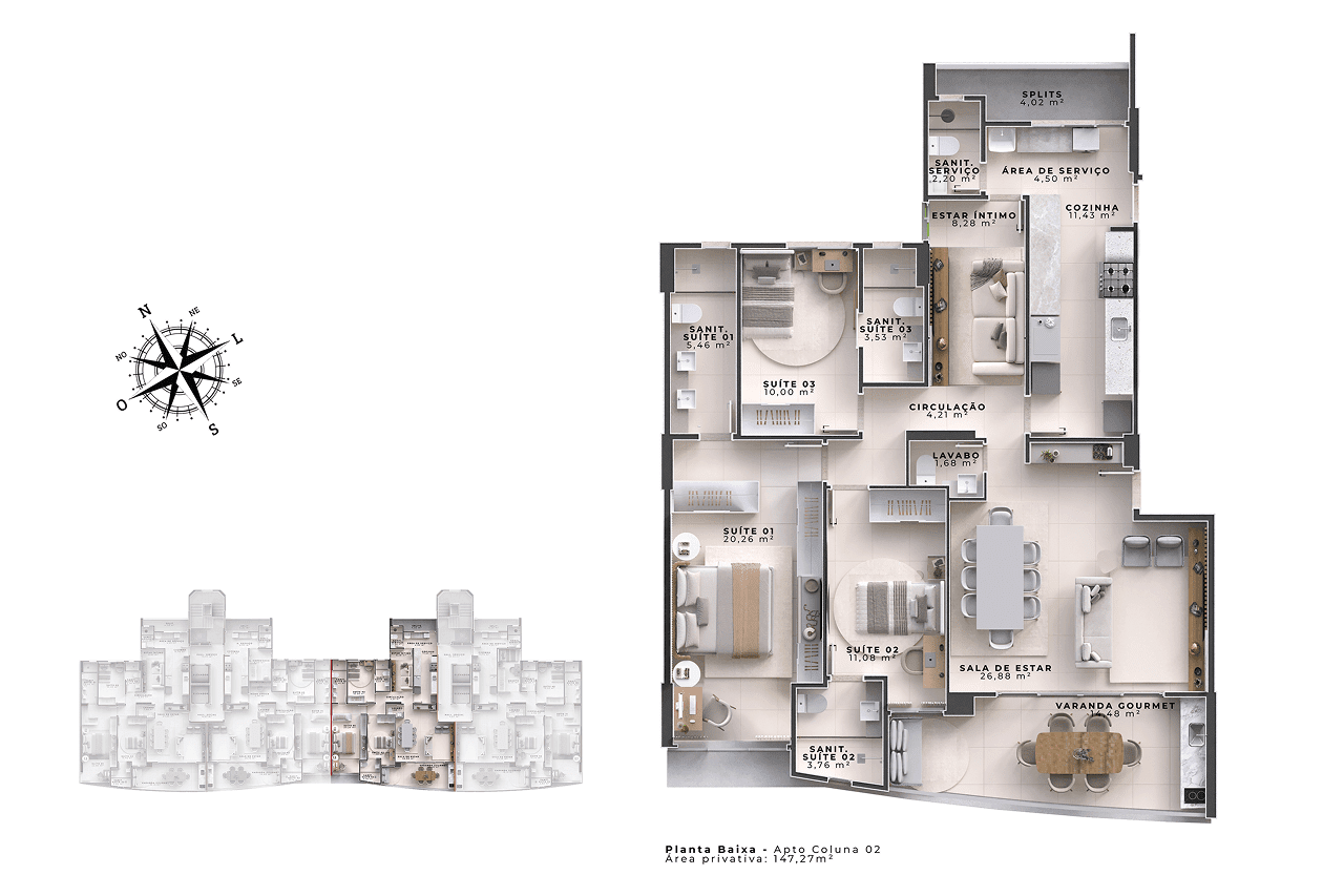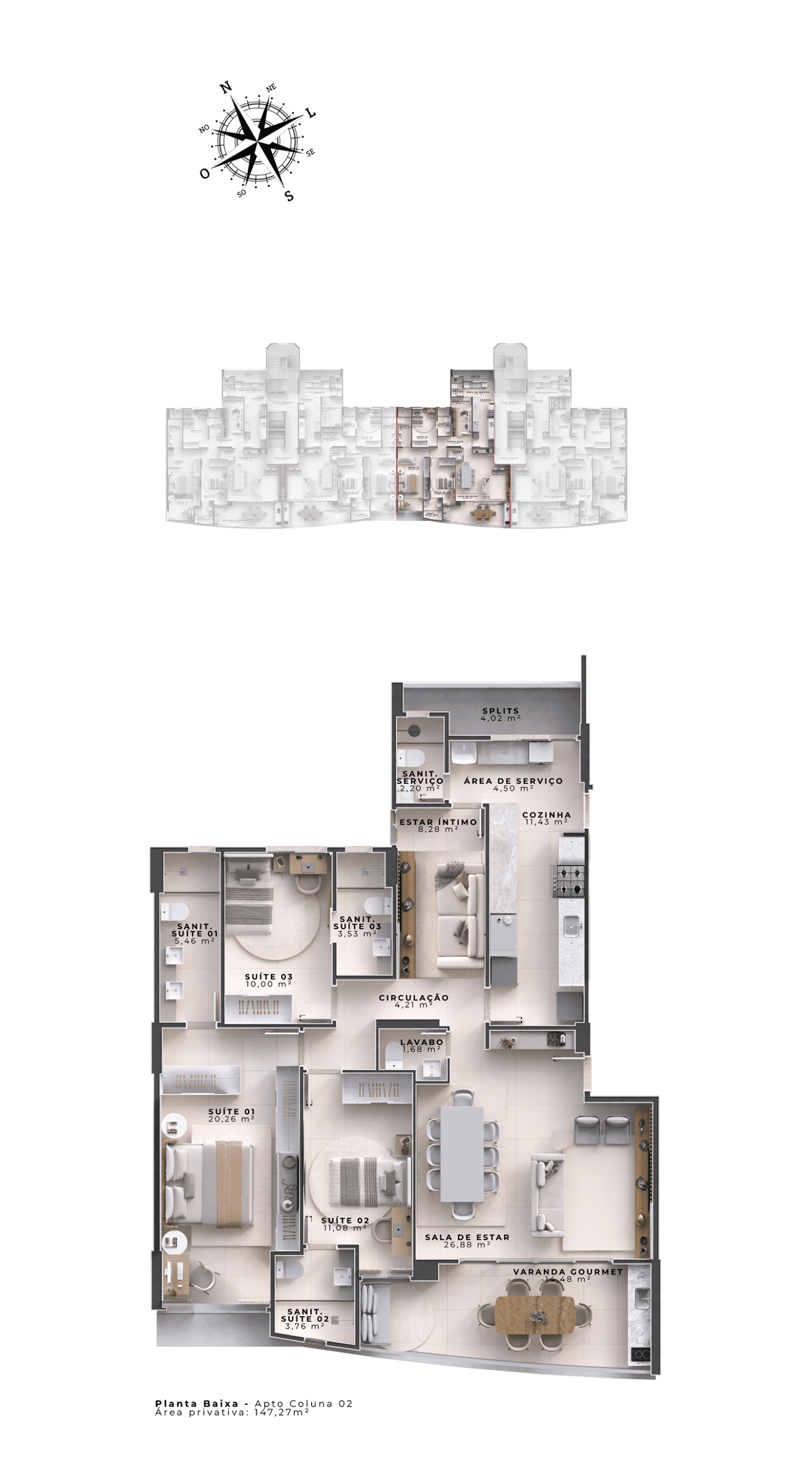 - 147,28 m²: 3 suítes + lavabo + multiuso.